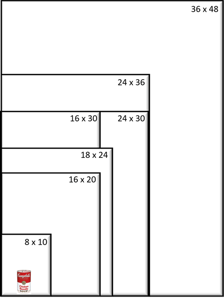 The size of the canvas heavily dictates the price of the artwork. The bigger the size, the more room for detail, and the greater the cost of the un-painted canvas to the studio. (See sizing chart below)